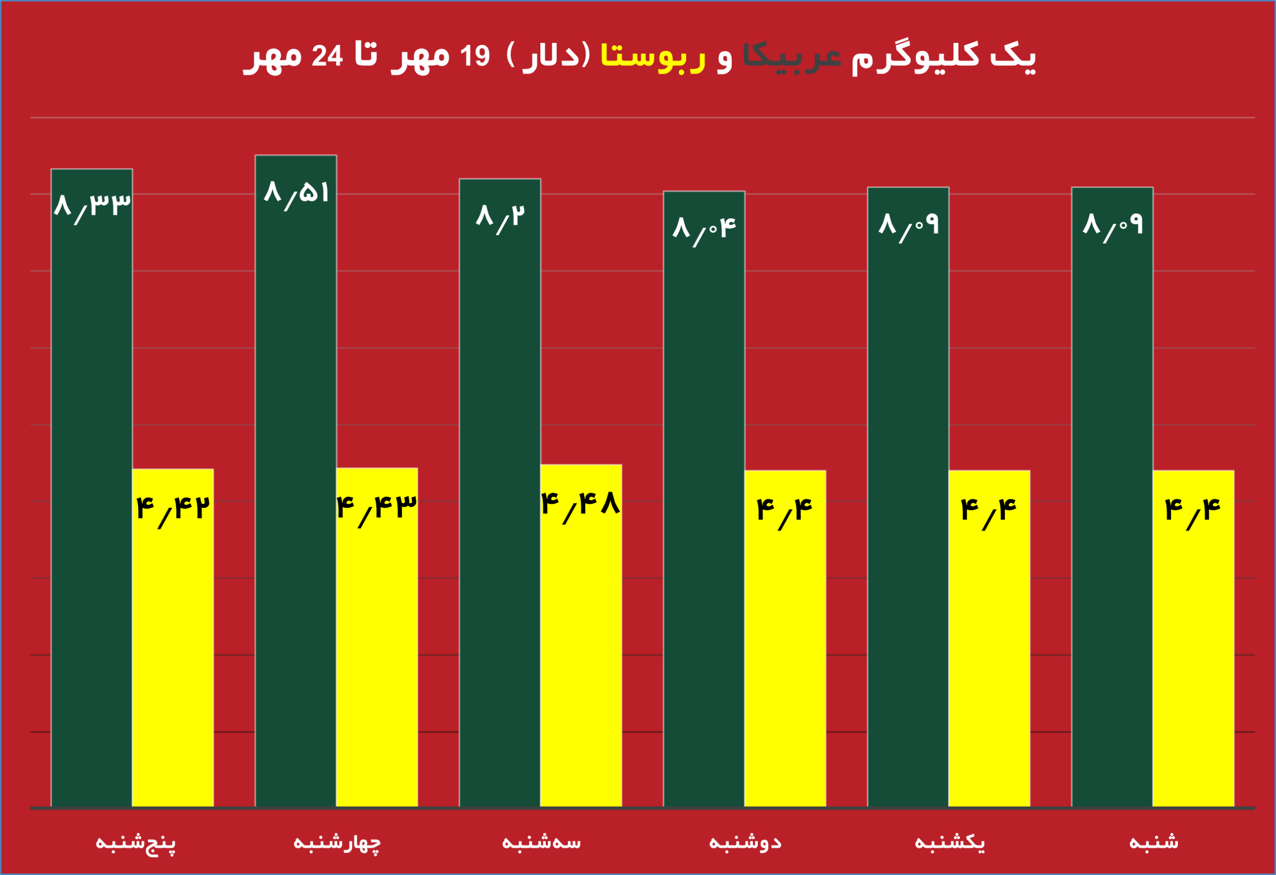 گزارشات تغییر و تحولات قیمت عربیکا و ربوستا در یک هفته اخیر (از 19 مهر تا 24 مهر ماه ):